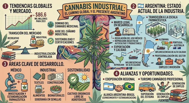 La industria del cannabis avanza hacia una profesionalización, legalización y diversificación tecnológica, consolidándose como un mercado global con un crecimiento proyectado a 86.600 millones de dólares para 2031. Las tendencias clave muestran una transición desde el enfoque recreativo hacia el médico y el cáñamo industrial, con énfasis en la calidad, la sostenibilidad y el valor agregado.